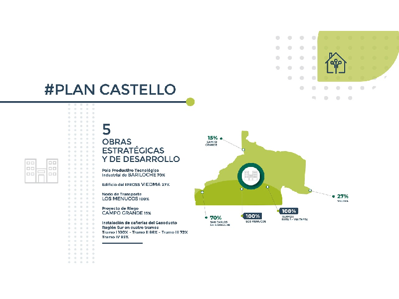 La repavimentación de caminos productivos se encuentra en un 92% de avance en Río Colorado y 58%, en Chichinales. Ambas finalizarán en 2020. La estación transformadora de El Solito tiene 59% y la de General Conesa, un 57%; y la línea de alta tensión Pomona-El Solito está en un 8% de avance y El Solito–General Conesa, al 16%. Todas estarán listas el año que viene, en 2021.