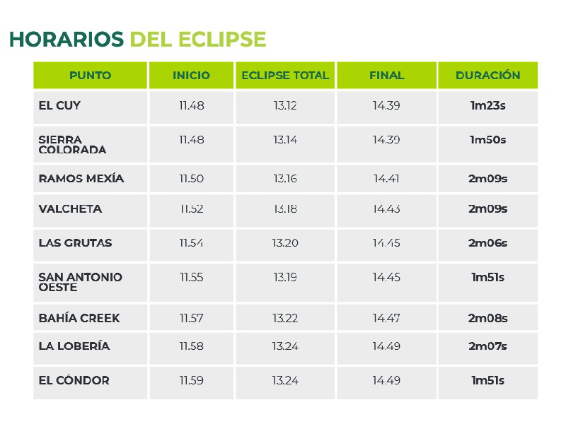 El evento comenzará a las 11.48 en el extremo Noroeste de la provincia. El Cuy será la primera localidad alcanzada por el fenómeno. El punto de totalidad será a las 13.12 y se estima que dure 1m23s.